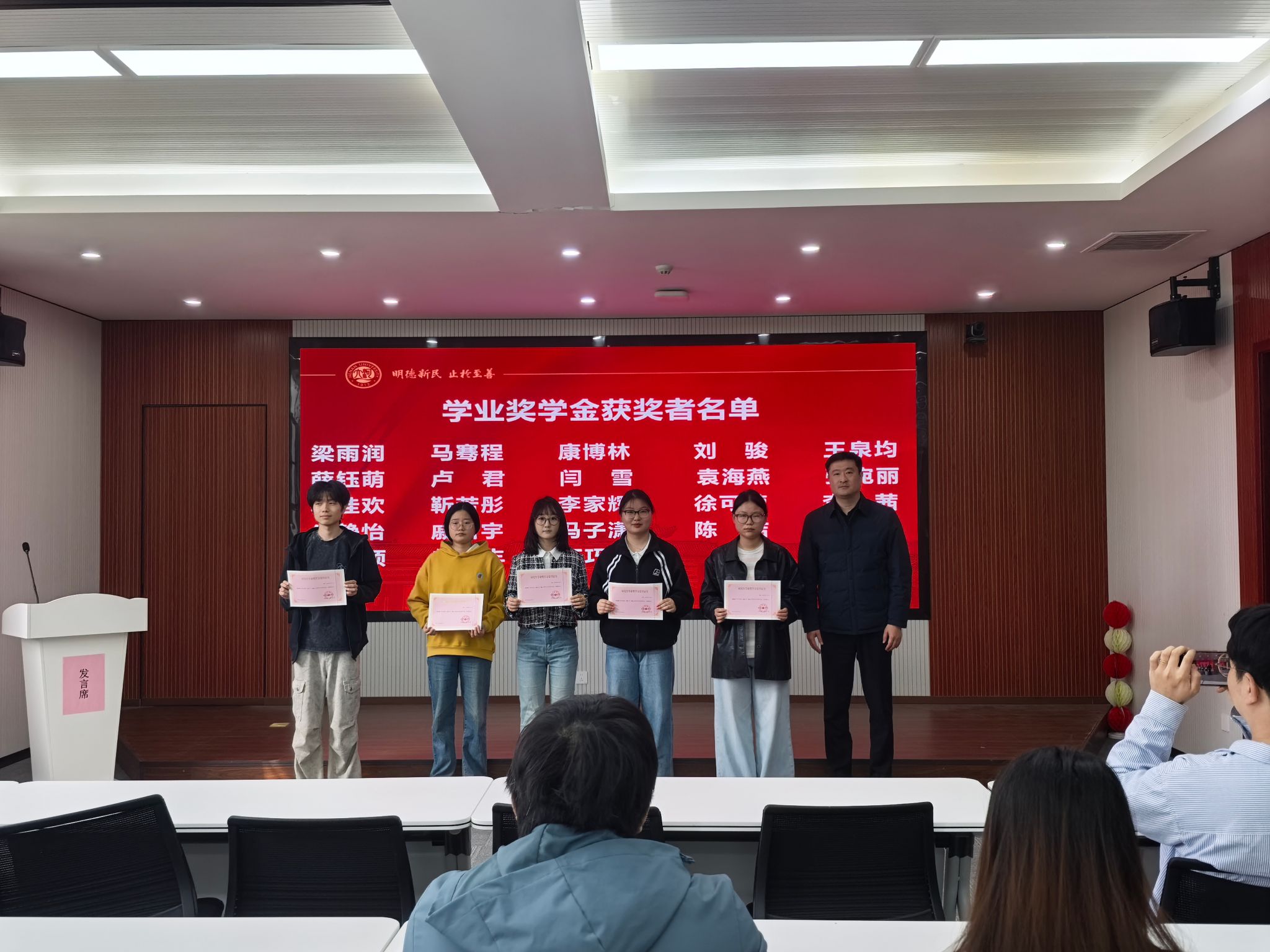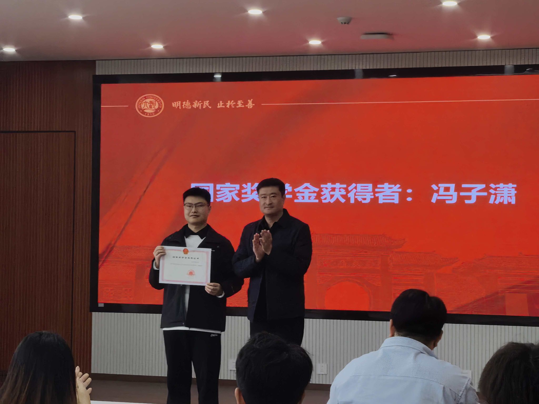 颁奖环节有序开展,董文副书记首先为国家奖学金获得者冯子潇同学颁发荣誉证书,向其表示热烈祝贺。随后,研究生学业奖学金获得者分三组登台,董文副书记为获奖同学逐一颁发证书,并与全体获奖同学合影留念,定格荣耀瞬间,传递奋进力量。
