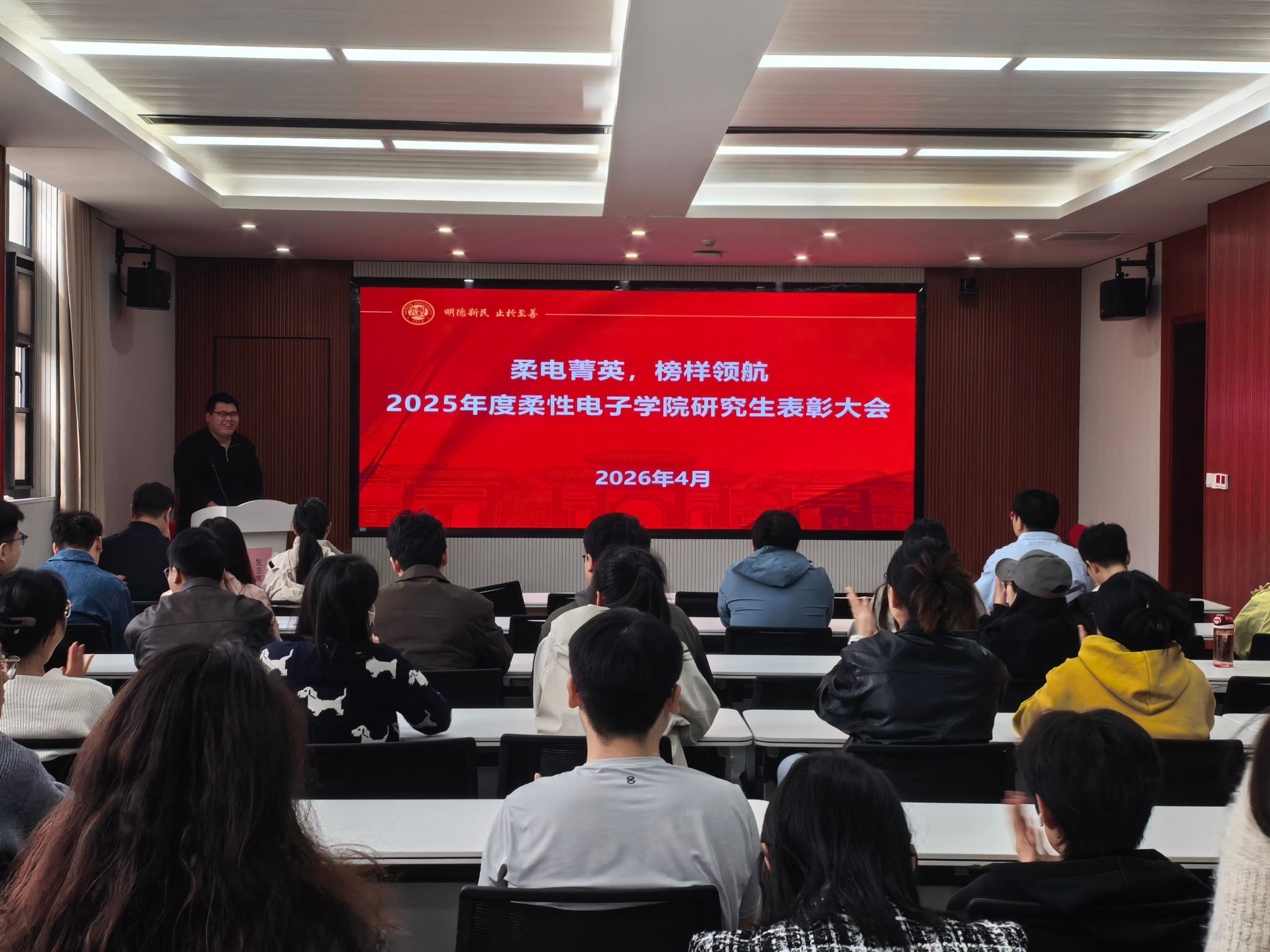 董文副书记在总结致辞中,再次向全体获奖同学表示热烈祝贺,充分肯定了过去一学年全院研究生在学术科研、综合素质提升等方面取得的显著成绩。他寄语受表彰的同学,要珍惜这份荣誉、再接再厉,充分发挥榜样示范引领作用;同时勉励全院研究生以先进典型为标杆,脚踏实地、潜心治学、勇于创新,在柔性电子领域深耕细作,努力书写无愧于时代、无愧于青春的精彩篇章。