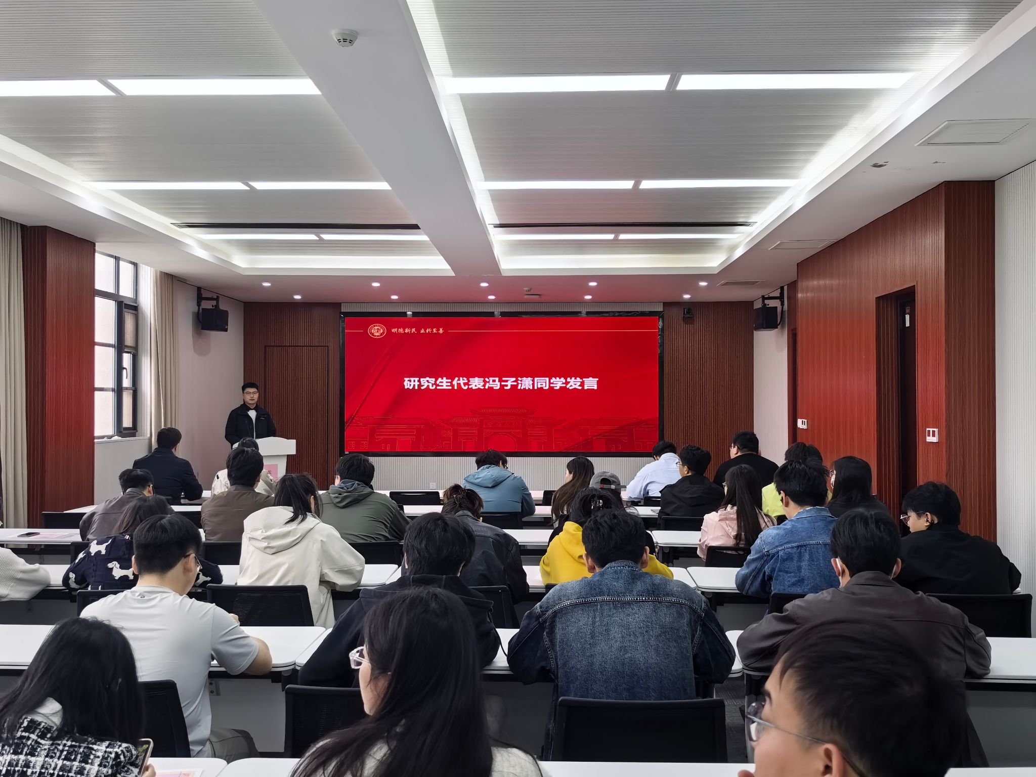 研究生教育工作稳步推进,学子们在在学术科研、创新实践等方面深耕细作、奋勇争先,取得扎实成效,涌现出一批品学兼优、勇于创新的优秀代表。活动现场,研究生辅导员谷志达老师宣读了2025学年研究生表彰决定及表彰名单,其中冯子潇同学荣获国家奖学金,梁雨润、马骞程等25名同学荣获研究生学业奖学金。